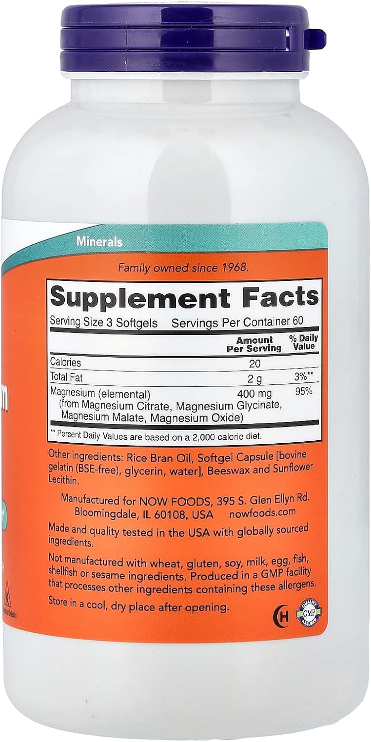 Magnesium is a mineral that is critical for energy production and metabolism, muscle contraction, nerve impulse transmission, and bone mineralization. It is a required cofactor for an estimated 300 enzymes. Among the reactions catalyzed by these enzymes are fatty acid synthesis, protein synthesis, and glucose metabolism. Magnesium status is also important for regulation of calcium balance through its effects on the parathyroid gland. Magnesium Citrate is easily absorbed, and NOW Magnesium Citrate Softgels are provided in a liquid base with chelated forms for superior bioavailability.